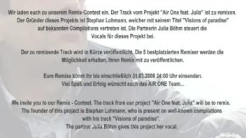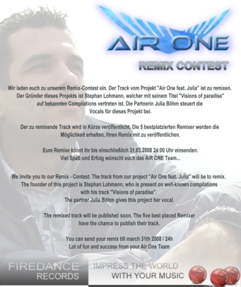 Wir laden euch zu unserem Remix-Contest ein. Der Track vom Projekt "Air One feat. Julia" ist zu remixen. Der Gründer dieses Projekts ist Stephan Lohmann, welcher mit seinem Titel "Visions of paradise" auf bekannten Compilations vertreten ist. Die Partnerin Julia Böhm steuert die Vocals für dieses Projekt bei.