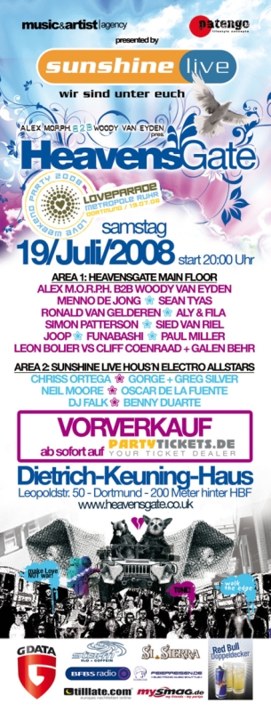 Für mich wird das jetzt alles komplizierter, eigentlich will ich zu Paul weil ich absoluter Fan bin andererseits hat Heavens Gate ein Line Up mit mehr schöner Trancemusik und Mousse T und sowas interessiert mich so gar nicht. Wobei solche wie Moguai oder Westbam aber auf jeden Fall Spass machen.