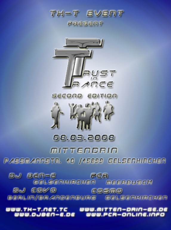 ich darf euch mit Stolz verkünden, dass alles in trockenen Tüchern liegt und die Trust in Trance - the second edition am 08-03-2008 im Mittendrin (Gelsenkirchen) stattfinden wird. Das Line Up ist wieder ähnlich wie letztes Jahr. Allerdings haben wir einen Special Guest aus Brandenburg im Schlepptau. An diesem Abend wird Dj Covo (Trance of Summer) euch mit seinen Beats so richtig zum beben bringen.