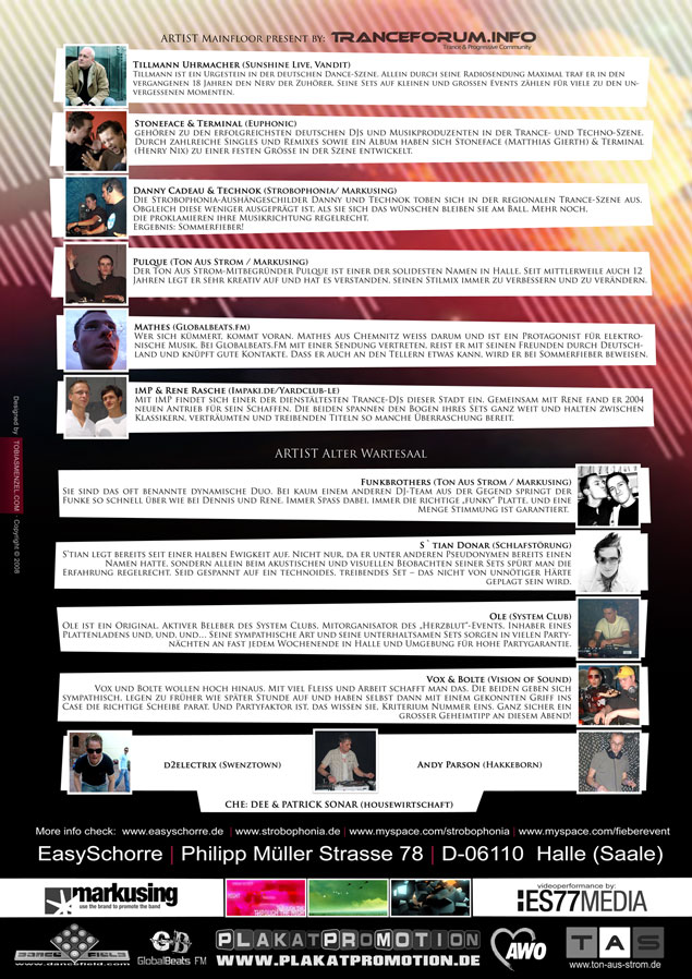 Auf dem ausgewählten Linup der Veranstaltungen finden sich Namen wie Tillmann Uhrmacher und Stoneface & Terminal genauso wieder wie langjährige DJ's der Halleschen Musikszene und Newcomer. Desweiteren soll die Location um einige optische Veränderungen erweitert werden. So findet sich neben einer Lasershow auch die optische Umrandung der Acts durch einen Visual Jockey genauso wieder wie eine für dieses Event eigens produzierte Trancehymne. Es dürfte also spannend werden am 18.07.2008 in Halle.