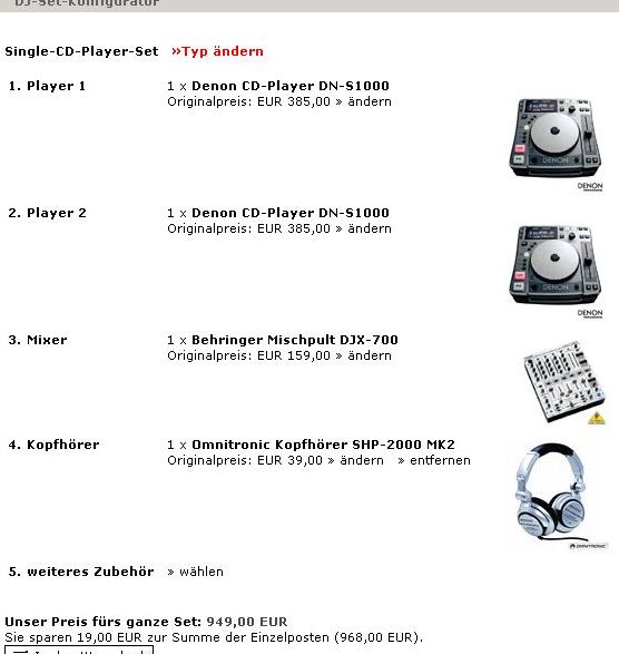 Kopfhörer: NUMARK PHX PRO ca. 60 €Damit wärst Du bei ca. 1360 €. Ist zwar etwas mehr, aber damit hast Du mit unter das beste Preis-/Leistungsverhältnis.