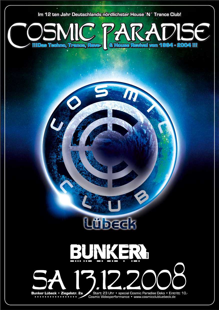 Danach feierte die Partycrowd knappe 10 Jahre im Rider´s Cafe und nun seit 1 Jahr im Bunker in Lübeck auf den Cosmic Veranstaltungen! Der Cosmic Club Lübeck hat sich bis heute über Lübecks Grenzen hinaus etabliert!