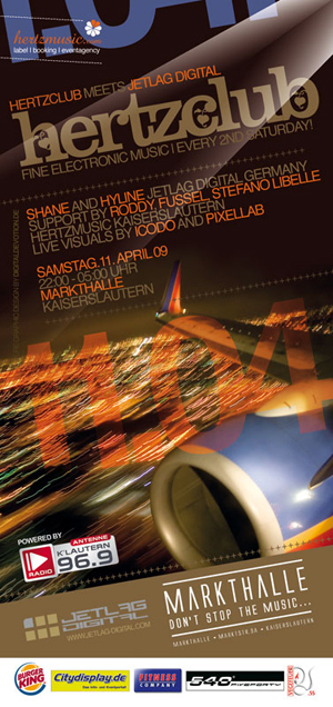 Im Monat April kommt es zum Treffen der beiden Labels Hertzmusic und Jetlag Digital in der Markthalle Kaiserslautern. Ein besonderes Event, auf das sich nicht nur die Hertzmusiker freuen, denn mit den Betreibern von Jetlag Digital verbindet sich eine enge Freundschaft. 2008 veröffentlichte Jetlag Digital 28 EP’s und drei Artist-Alben, die weltweit in etwa 70 Stores erhältlich sind und hat es zudem als Newcomer-Label bereits mehrmals geschafft, sich in den Top100 der internationalen Progressive- House Charts zu platzieren.
