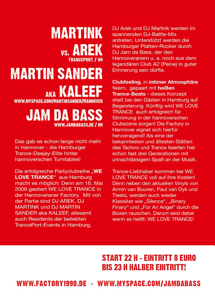 Neben den aktuellen Vinyls von Armin van Buuren, Paul van Dyk und Tiesto, werden auch wieder Klassiker wie „Silence“, „Binary Finary“ und „For An Angel“ durch die Boxen rauschen. Darum seid dabei wenn es heißt: WE LOVE TRANCE!DJ Arek (Tranceport / HH)