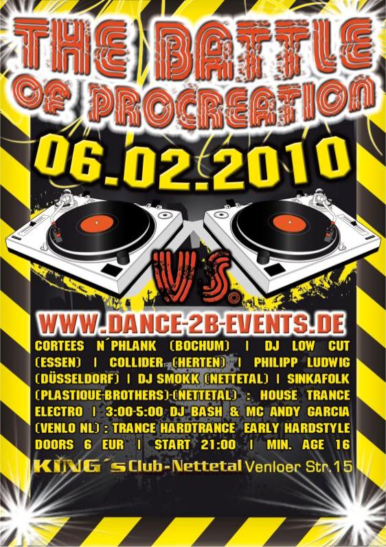 Für den zweiten Abend The Battle of procreation Part II, wo das Datum noch nicht bekannt ist, werden wir unseren Fokus auf die Musikrichtungen hands up, dance und jumpstyle/hardstyle, richten.