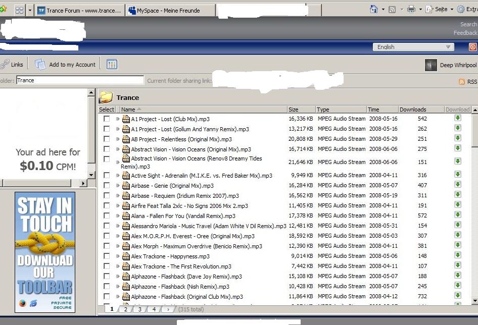 Auf diese Weise kommt man als User stets einfach und schnell kostenlos an die neuesten, aber auch älteren Trance-Produktionen. Zwar muss man wohl anscheinend eine kleine Gebühr von 10 EUR per Paypal überweisen, die aber erstens angesichts der Masse an Downloads läppisch ist und zweitens ja wohl auch nie den Künstlern zugute kommen wird. Mal abgesehen davon, dass sich diese Möglichkeit des freien Downloadens wohl ein gutes Stück auf dem Gebiet der Illegalität zu bewegen scheint, finde ich die ganze Sache ungeheuerlich! :upset: