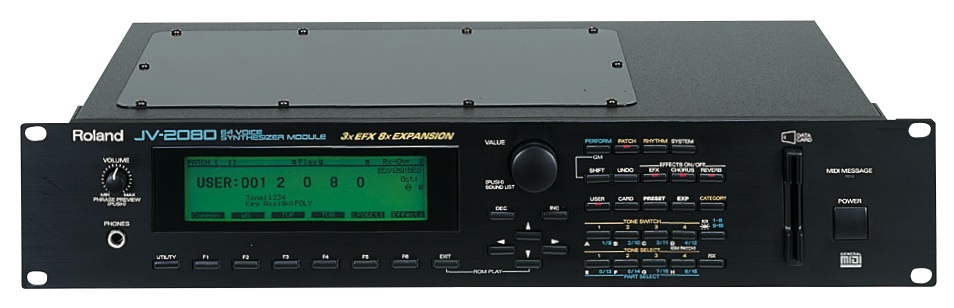Wesentliche Daten: Der JV-2080 von Roland ist ein 64-stimmiger Synthesizer im Rackformat, belegt zwei Höheneinheiten