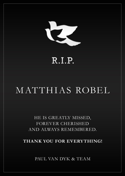 Matthias Robel a.k.a. Matthias van Jansen, User des Tranceforums und offenbar auch Freund der van Dyks, ist im Alter von 29 Jahren verstorben. Über die Hintergründe ist mir derzeit Nichts bekannt! Vor neun Tagen war er hier noch online...
