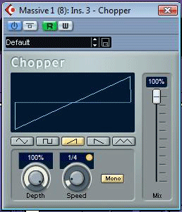 Ich arbeite hier mit Cubase SX 3 und einem Sound von NI Massive. Hinzu kommt ein Effekt namens Chopper, der direkt zur Ausstattung von Cubase gehört (siehe Bild).