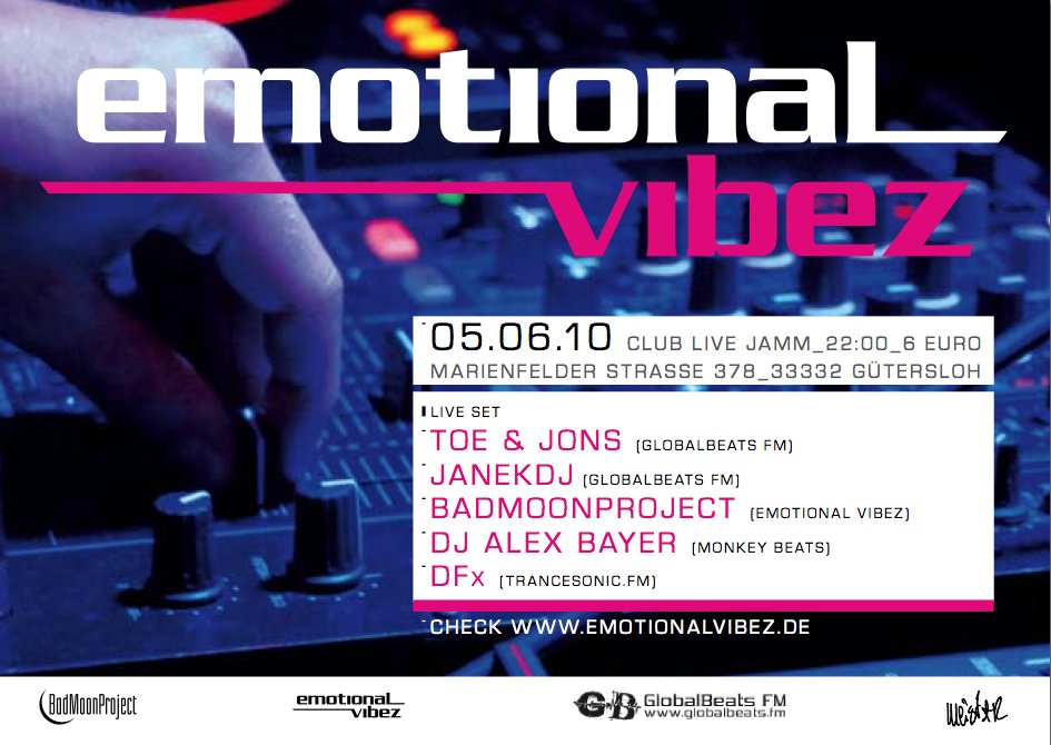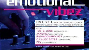 Um die anhaltende Euphorie musikalischer Darbietungen dieser Art nicht verstummen zu lassen präsentieren wir euch ein weiteres Highlight in Sachen elektronischer Musikkultur. Unter dem Motto "feel the emotion - feel the vibez" startet im Club Live Jamm in Gütersloh eine Party, die musikalisch alles hier bisher dagewesene toppen wird. Durch die Nacht führen euch neben dem Organisator BadMoonProject die überregional bekannten Radio DJ`s DFx, Alexander Bayer, Toe & Jons - sowie Emotional Vibez Resident JanekDJ von Globalbeats.fm.