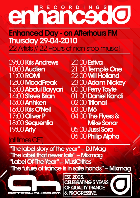 Am 29. 04. Gibts bei https://www.tranceforum.info/www.afterhours.fm im Rahmen des 5 jährigen Bestehens des labels ein richtig dickes label special vom Enhanced Recordings.