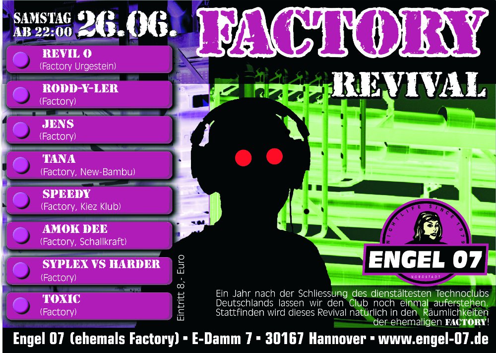 ZitatAlles anzeigenEin Jahr nach der Schliessung des dienstältesten deutschen Technoclubs, der Factory in Hannover, lassen wir den Club nochmal auferstehen.