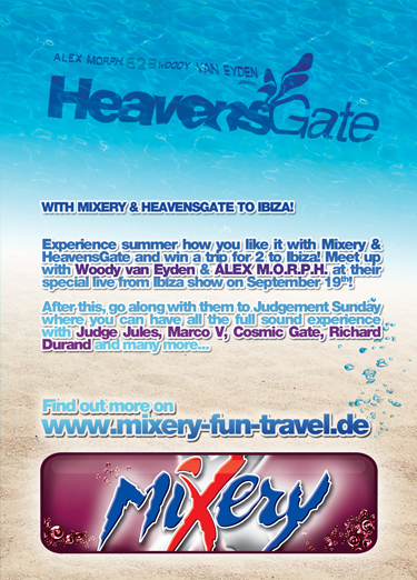 Marschiert doch mit Alex M.O.R.P.H. und "Tranceanimal" Woody van Eyden durch den VIP-Eingang. Wie gehts das? Ganz einfach: Bei Mixery und HeavensGate gibt es einen Trip für 2 nach Ibiza zu ersteigern! Unterkunft und Flug sind dabei! Triff die DJs Woody van Eyden und Alex M.O.R.P.H. am 19. September live in ihrer Ibiza Special Radioshow und begleite sie dann als VIP zum Judgement Sunday.