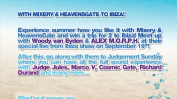 Marschiert doch mit Alex M.O.R.P.H. und "Tranceanimal" Woody van Eyden durch den VIP-Eingang. Wie gehts das? Ganz einfach: Bei Mixery und HeavensGate gibt es einen Trip für 2 nach Ibiza zu ersteigern! Unterkunft und Flug sind dabei! Triff die DJs Woody van Eyden und Alex M.O.R.P.H. am 19. September live in ihrer Ibiza Special Radioshow und begleite sie dann als VIP zum Judgement Sunday.