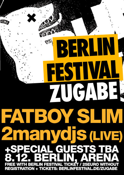 Liebe Berlin-Festival-Besucher,es ist soweit! Zwei Wochen nach dem Event auf dem Flughafen Tempelhof dürfen wir nun den Termin für unsere bereits angekündigte Berlin Festival Zugabe bekannt geben. Am 8. Dezember machen wir zusammen mit Fatboy Slim und 2manydjs unser Versprechen wahr. Endlich können die beiden Acts der Hangar-4-Stage mit ihren formidablen Sets auftrumpfen. Zwar nicht auf dem Flughafen Tempelhof, dafür in der Arena Berlin.