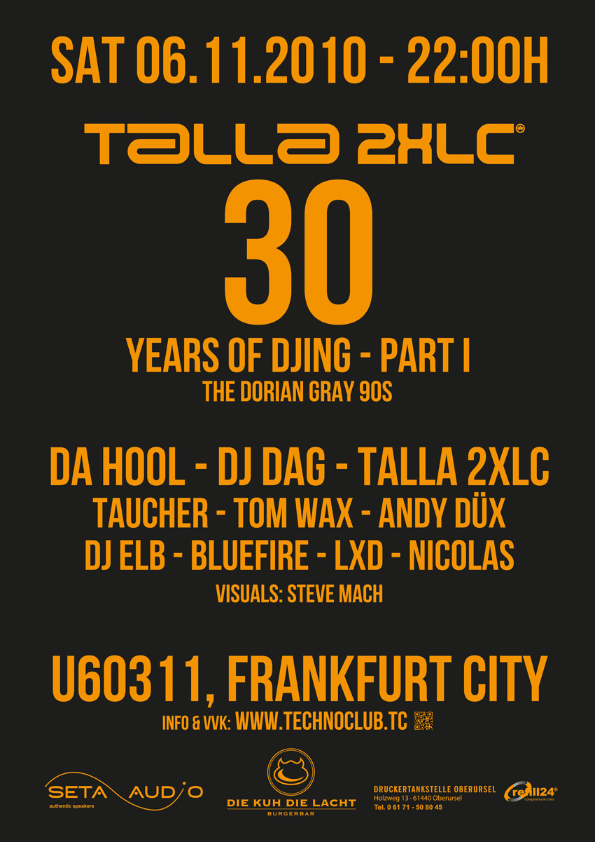Der Talla feiert seine 30jähriges DJ-Jubiläum und lässt die 90er noch einmal aufleben. Thema dieser Nacht im Technoclub: "The Dorian Gray 90s"! Gefeiert wird im Frankfurter Club U60311 und das Line-Up dürfte besonders für die Alten Hasen unter uns ein wahrer Leckerbissen sein: