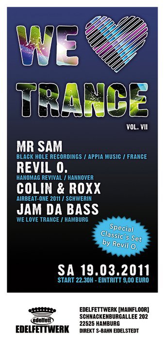 9.03.2011 We Love Trance (Vol. VII) @ Edelfettwerk (Mainfloor!) /HHIm Frühjahr dürfen die Herzen der Trance-Fans wieder höher schlagen, denn im Hamburger Edelfettwerk versorgen wir die Partycrowd aus Norddeutschland erneut mit Feiertrance vom Feinsten!