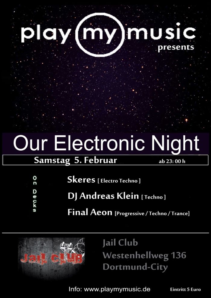 Wir hoffen ihr seid dabei und feiert mit uns in diesem Wunderschönen Club die 1rste Our Electronic Night des Jahres 2011."