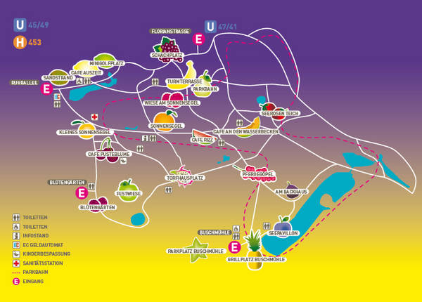 Der Westfalenpark Dortmund erwartet Euch auch dieses Jahr wieder mit seiner unvergleichlichen Atmosphäre und seinen unterschiedlichen fruchtigen Bereichen zum Tanzen, Feiern und Chillen. Und damit sich auch wirklich niemand bei vielleicht etwas mehr als 0,5 Promille in der Nacht in diesem wirklich großen Park verläuft, haben wir für Euch das Obstleitsystem weiter perfektioniert.
