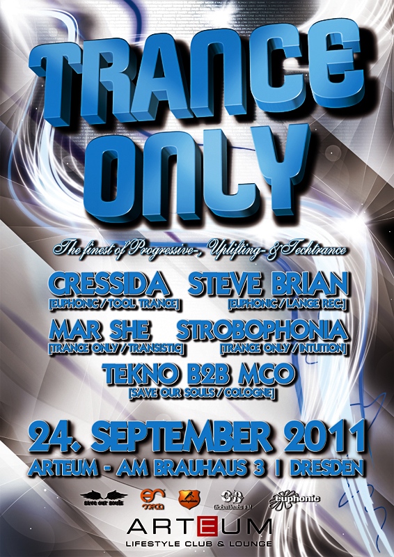 Nachdem die ersten beiden Trance Only Veranstaltungen erfolgreich in Sachsen-Anhalt stattfanden, wollte man über den Tellerrand schauen und etwas Neues probieren. Marco alias "mar she" aus Sachsen war der Meinung diesen Schritt zu unterstützen, und lädt nun in diesem Zuge zu seinem BDAY ins Arteum, und zelebriert damit die 3. Trance Only, bzw. die erste ihrer Art in Dresden!