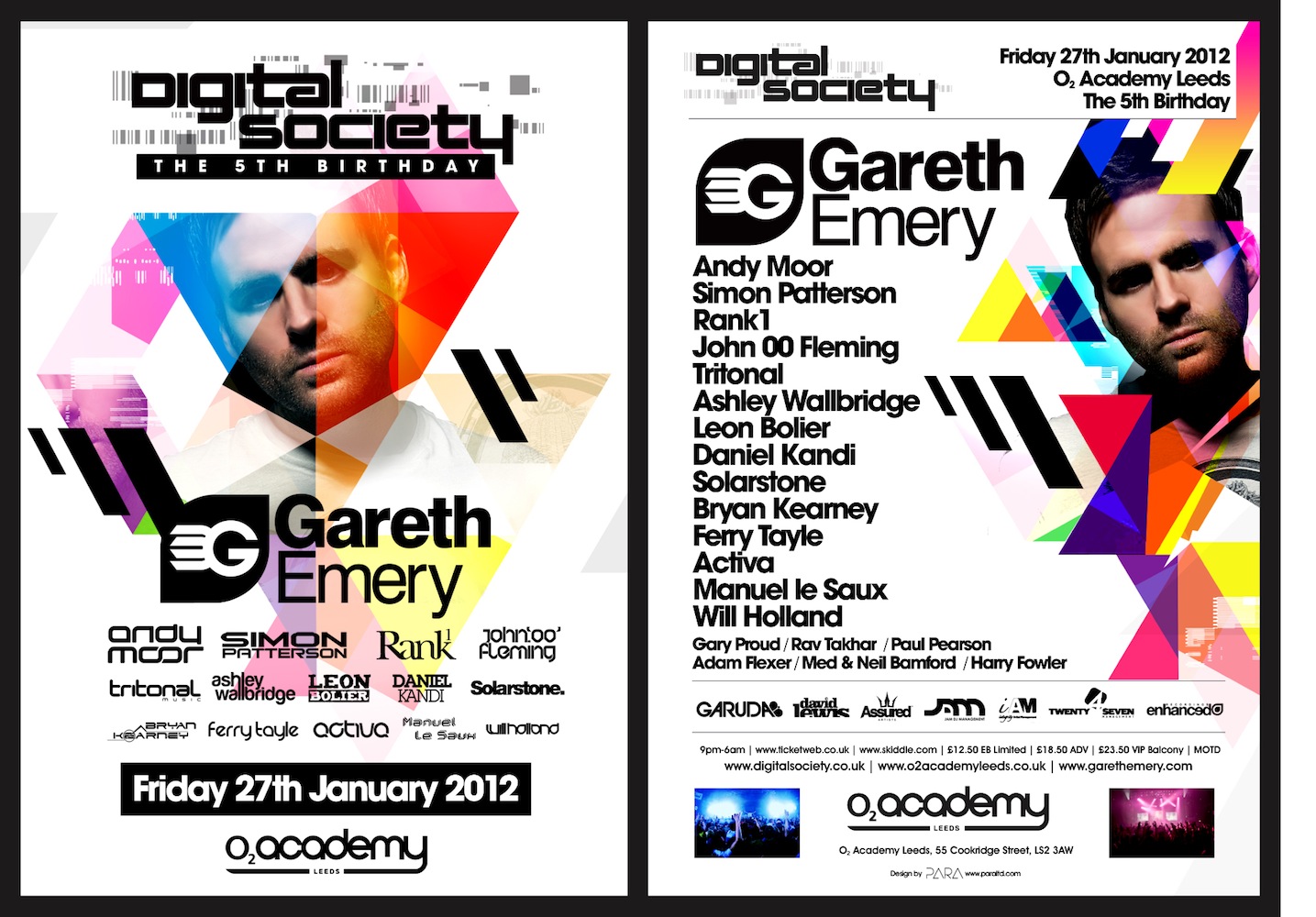 Digital Society Leeds celebrates five years at the forefront of the UK Trance scene with the biggest event in DS history and headlining the 5th Birthday spectacular is UK superstar and global Trance icon GARETH EMERY with a very special DS anniversary set, returning to Leeds for the first time since the Northern Lights Concert. Gareth has been responsible for some of the Trance modern day greats, including 'Sanctuary', 'Exposure' and 'Metropolis' all the recent years and after 2010's chart-topping debut artist album Northern Lights, the market leading podcast 'TGEP' and the continued immense success of his own label Garuda, alongside an almost unrivalled global touring schedule covering the world's biggest festivals and clubs - Gareth Emery is considered one of the definitive acts in todays world dance music scene.