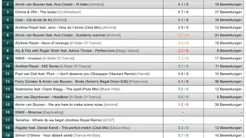 Insgesamt sind - gemessen am Geschmack der Tranceforum-User - wohl eher durchschnittliche Tracks in der ASOT Top20 gelandet. Ich habe dazu mal die aktuellen Track-Rating Werte gegenübergestellt.
