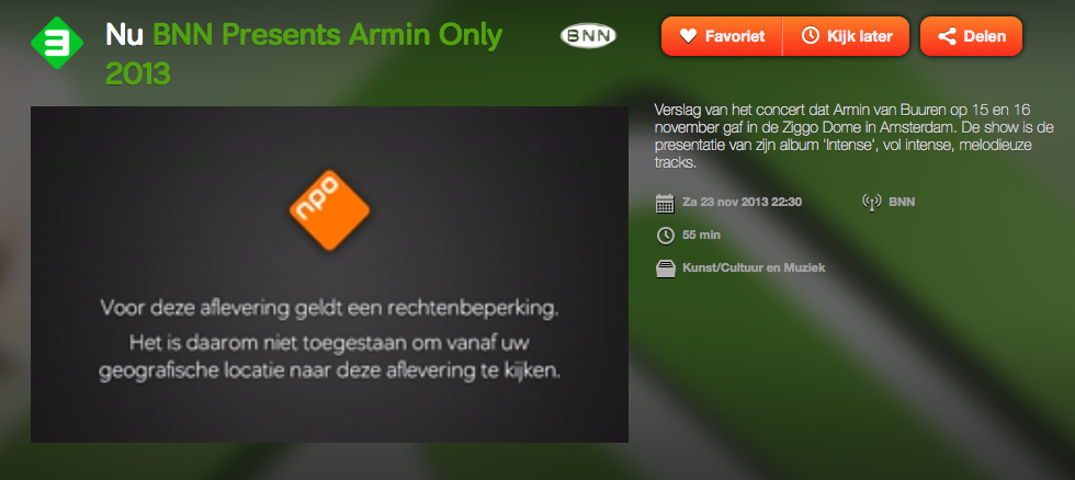 Wenn man aber nicht gerade über einen holländischen Server online ist bekommt man keinen Zugang zu diesem Stream! Da steht dann nur so in etwa das gleiche wie bei Youtube mit diesem Urheberrechtstext da!