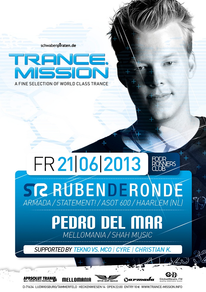 Süddeutschlands legendäre Trancepartyreihe TRANCE.MISSION geht in die nächste Runde! Zur "Summer Edition" wird der erfolgreiche Trance-DJ und Producer Ruben de Ronde erstmals die süddeutsche Clubcrowd rocken und mit druckvollen Trancetunes verwöhnen! Der sympathische Niederländer, wohnhaft in Haarlem bei Amsterdam, hat es inzwischen - nicht zu Letzt Dank seiner Mitarbeit in der "A State Of Trance" Crew und seiner "The Sound Of Holland" Radioshow - in der Szene ganz nach oben geschafft. So spielt er Woche um Woche auf den angesagtes Festivals und Events rund um den Globus - und nun ist endlich die TRANCE.MISSION an der Reihe! In der clubbigen Atmosphäre des Four Runners Clubs in Ludwigsburg / Tammerfeld werden die Veranstalter von Schwabenpiraten Events wie gewohnt High Quality Trance bieten - bei absolut fairen Preisen an Tür und Bar sowie einer massiven Light- und Lasershow.