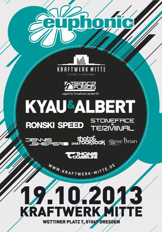 Als Gäste am 19.10.2013 haben Kyau & Albert mit Ronski Speed und Stoneface & Terminal weitere Euphonic-Künstler eingeladen, die mit ihren erfolgreichen Veröffentlichungen, Labelgeschichte geschrieben haben. Ronski Speed hat im Sommer 2013 sein neues Album "Second World" veröffentlicht... Am 19.10. wird es eine exklusive Signier- und Fotostunde mit Ronski Speed im Kraftwerk geben.