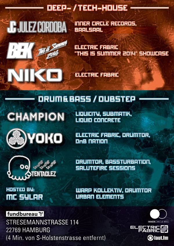 Die Style-Vielfalt ist wieder da - und wie nun schon mehrfach kampferprobt, bekommt ihr bei ELECTRIC FABRIC die perfekte Mischung aus tanzbarem Deep- & Tech-House, sowie actiongeladenem Drum&Bass und Dubstep aufgetischt!