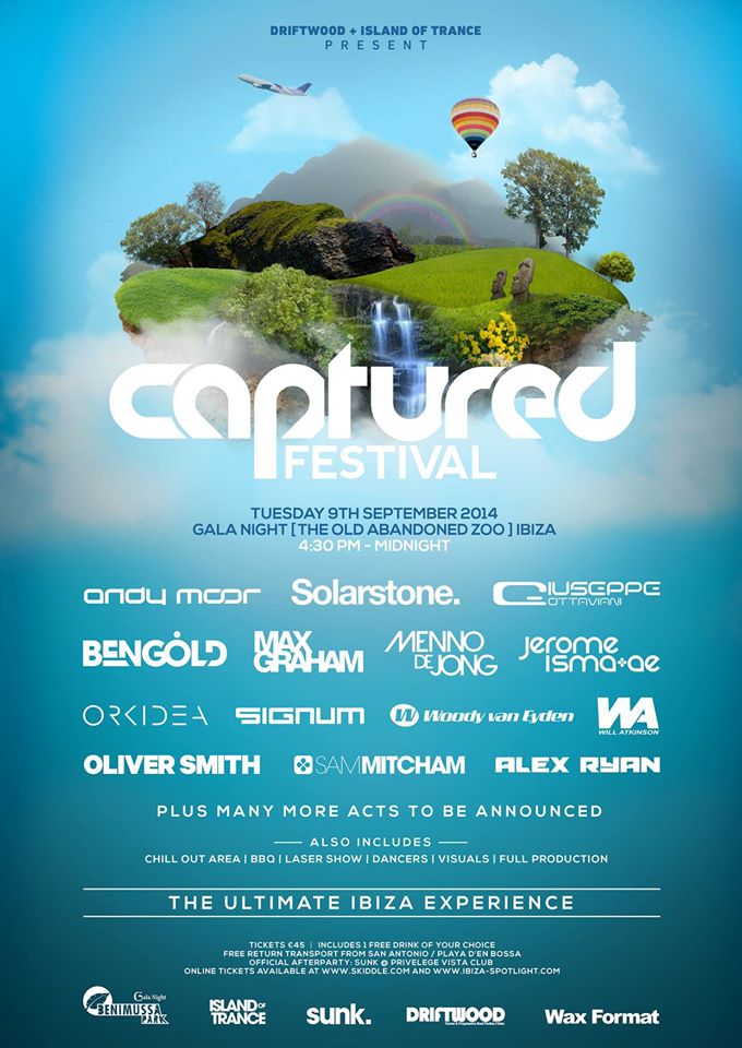 ZitatAlles anzeigenCaptured Festival returns to the magical surrounding of Galanite (The Old Abandoned Zoo) for a very special event. Taking place on Tuesday 9th September with an array of world class acts that are guaranteed to blow your mind. Featuring Andy Moor, Solarstone, Giuseppe Ottaviani, Ben Gold, Max Graham, Menno De Jong, Jerome Isma-ae, Orkidea, Signum, Woody Van Eyden, Will Atkinson, Oliver Smith with support from Captured resident's Sam Mitcham & Alex Ryan aswell as the Island Of Trance djs + guests.
