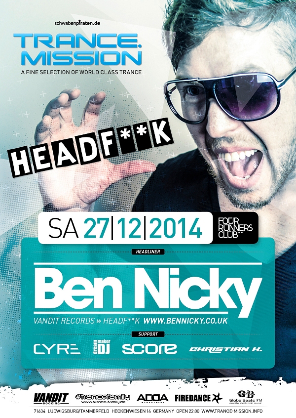 Noch einmal wollen es die Macher der Trance.Mission im Jahr 2014 so richtig wissen! Und starten den Jahresendspurt direkt nach den Weihnachtsfeiertagen mit einem richtig großes Trance-Feuerwerk. Als Highlight präsentieren sie euch am 27. Dezember neben ihrem Support Act und den Trance.Mission Residents eine Süddeutschlandpremiere mit einem der heißesten Acts der Trance Szene – Ben Nicky!