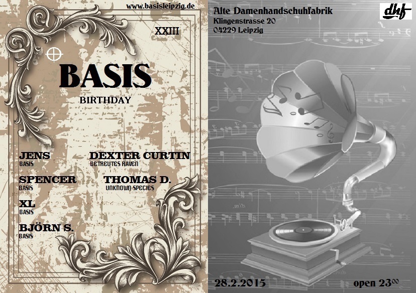23. Februar 2015 um 23:33 #1 BASIS Birthday - Alte Damenhandschuhfabrik LeipzigJENS / basisSPENCER / basisXL / basisBJÖRN S. / basis / vinylschleiferDEXTER CURTIN / betreutes ravenTHOMAS D. / unknown species