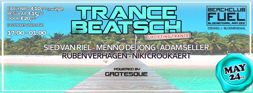Sunday, May 24, 1st Pentecost, all Trance lovers meet again at Beachclub Fuel! The team of Grotesque puts down a very tempting party under the name “TranceBeatsch”. The name says it all; Trance on the beach. Uplifting Trance to be precise. No gimmicks, just good music! Five Trance DJs in a super relaxing location with a frenzied crowd and a great Pentecostal Sun. The rest is up to you!