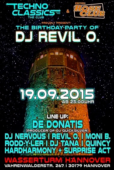 ZitatAlles anzeigenAm 19.09.2015 feiert DJ Revil O. seine beliebte Geburtstagsparty im WASSERTURM Hannover. Das ganze wird präsentiert von TECHNO CLASSICS und wird musikalisch eine Reise durch den legendären Rose Club (Hanomag Hannover) werden.