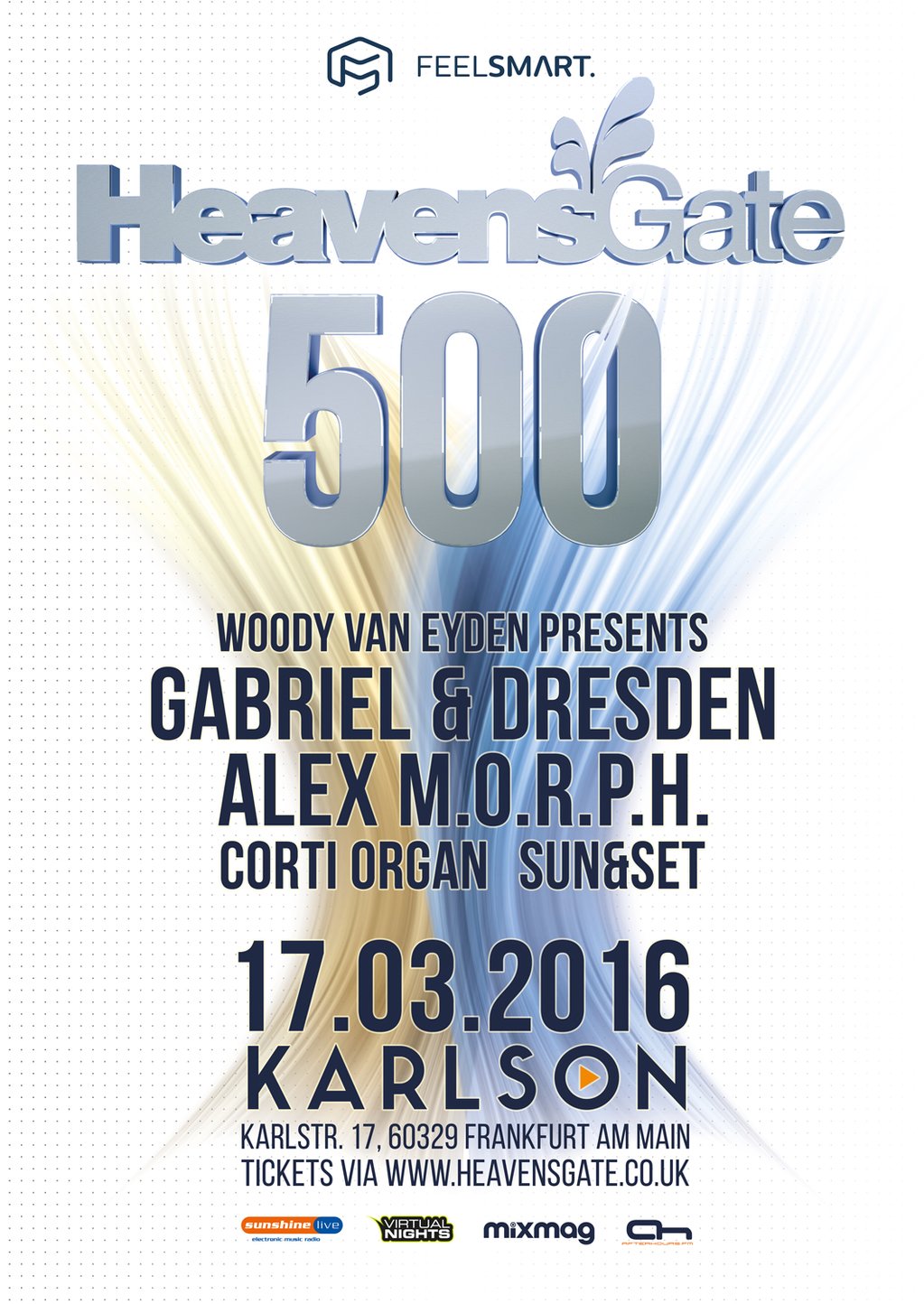 Heute ist HeavensGate eine der etablierten Trance- und Progressive-Marken in der elektronischen Musikszene schlechthin und feiert nun ihre 500. Episode der Sendung am 17.03. im Karlson Club Frankfurt. Für diesen Anlass hat Woody van Eyden niemand geringere als die Trance-Urgesteine Gabriel & Dresden verpflichtet, die unter verschiedenen Projekten mit Titeln wie “As the Rush comes” oder “Beautiful Things” zu Weltruhm gelangten. Abgerundet wird das Lineup neben Woody van Eyden selbst durch den weltweit heiß begehrten Mitbegründer von HeavensGate, Alex M.O.R.P.H. [Universal Nation // VANDIT Records] und die HeavensGate Residents Corti Organ [A State Of Trance // VANDIT Records] und SUN & SET [Fenology Records].