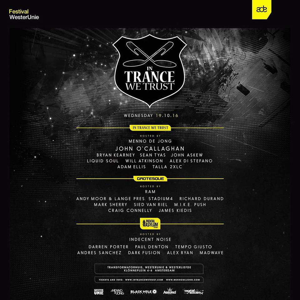 Wednesday October 19th 2016, three massive stages at the Dutch capital's iconic venues Transformatorhuis, Westerunie and Westerliefde hosted by In Trance We Trust and special guests Grotesque and Mental Asylum.