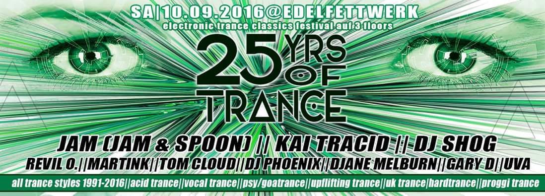 Am Samstag den 10.09.2016 im Edelfettwerk Hamburg, möchten wir die Norddeutsche Tranceszene - egal ob erst seit 1-2 Jahren mit der Musik infiziert oder schon "Trancer" der "ersten" Stunde, miteinander vereinen, um gemeinsam die unterschiedlichen Trance Styles der letzten 25 Jahre zu feiern ...