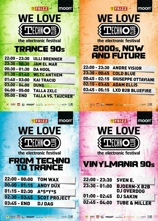 Wie in den Vorjahren steigt das beliebte „We Love Technoclub“-Festival im moon13, dem ehemaligen Cocoon-Club. Mit seinem Interieur und der phänomenalen Soundanlage gehört die Location zum Besten, das die Clubwelt zu bieten hat. Insgesamt 22 DJs werden die vier Dancefloors zum Kochen bringen. Auf dem futuristischen Mainfloor wird neben KAI TRACID („Trance & Acid“), DUNE (Hardcore Vibes“), JAM EL MAR (Jam & Spoon), ULLI BRENNER und TAUCHER auch Talla selber an den Decks stehen. Alle Freunde des neuen Trance bekommen auf Floor 2 mit GIUSEPPE OTTAVIANI (Italien, PureNRG), ADAM ELLIS (UK), COLD BLUE, ANDRE VISIOR sowie den TC-Residents LXD und BLUEFIRE einige echte Leckerbissen.