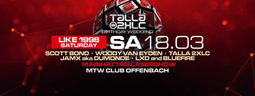 TALLA 2XLC feiert Geburtstag – und das ein ganzes Wochenende lang! Am Samstag lautet das Motto „Like 1998“ und der MTW-Mainfloor wird zu einem Epizentrum der Classix. Zu einer genialen Lasershow von Mainhattan Laser gibt es die größten Hymnen der unvergessenen 90er auf die Ohren. Dazu hat Talla mit SCOTT BOND einen der beliebtesten DJs aus dem legendären Gatecrasher-Club in UK eingeladen. Gemeinsam mit Solarstone erschuf er beispielsweise das Meisterwerk „3rd Earth“, zudem mixte er diverse Gatecrasher-Compilations.