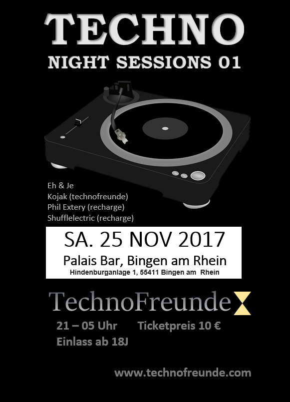 Am 25. November ist es endlich wieder einmal soweit. Eine Techno Veranstaltung in Bingen am Rhein. Viele alte richtig coole Trance-Lieder aus den 90igern werden an dem Abend gespielt. Es ist eine gute Mischung aus Hard-Trance bis aktuellen Deep Techno Sounds. Jedoch niemals zu hart. Gute Sounds zum tanzen.
