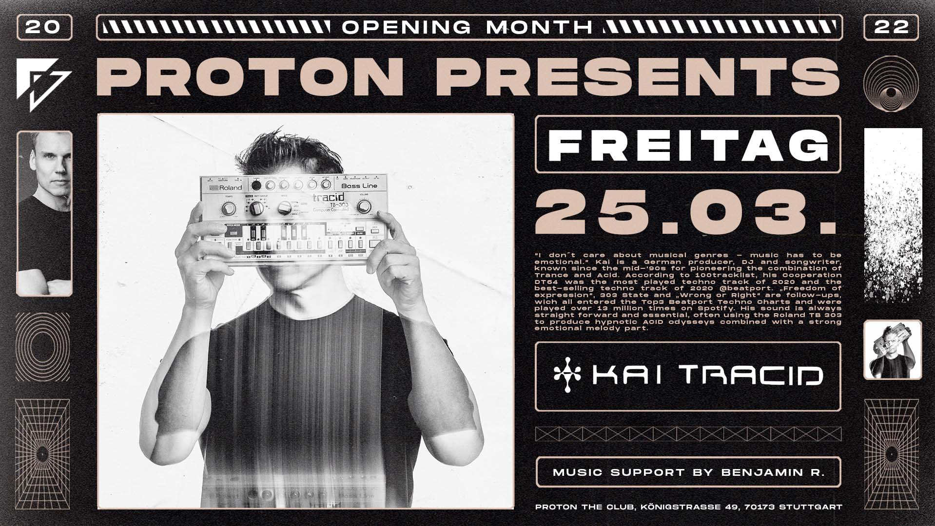 Der Mann ist vor wenigen Wochen 50 geworden, aber kein bisschen leiser. Zur Zeit ist er mehr auf dem Acid-Part in seinem Namen fokussiert, auch wenn er sich nach eigenen Angaben nicht um Genre-Bezeichnungen kümmert. Die Rede ist von Kai Tracid, der am Freitag, dem 25. März 2022 im Stuttgarter Proton spielen wird - die ganze Nacht lang.