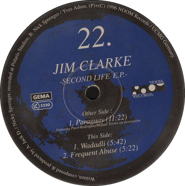 Ganz im Stile von Negative Return's "First Light" hat der Tausendsassa Torsten Stenzel im Jahre 1996 den Track "Paraguay" auf dem damaligen Top-Acid-Trance-Label Noom Records unter dem Alias Jim Clarke veröffentlicht. Es ist eine 11-minütige Reise durch eine perkussive Landschaft, in der sich in der zweiten Hälfte die Melodie entfaltet. "Wadadli" und "Frequent Abuse" lasse ich mal außen vor. Tatsächlich von anderen Producern und eher für den englischen Underground.