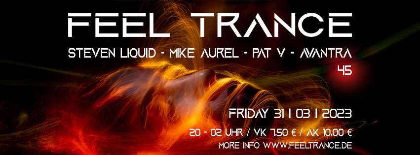 Musikalisch werden die beiden Resident DJs STEVEN LIQUID und MIKE AUREL an diesem Abend von PAT V aus den Niederlanden sowie AVANTRA von der Trance:Station aus Duisburg unterstützt.