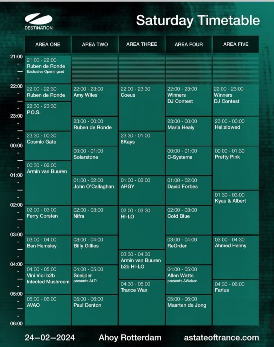 Ich bin gespannt auf die neue Location in Rotterdam. Für mich aufgrund der Entfernung tatsächlich das erste Mal mit Übernachtung vor Ort. Für mich gibt's Freitag gefühlt mehr unschöne Überschneidungen. Grober Plan ist irgendwie ein bisschen viel Stage Hopping, mal sehen was draus wird: Avira, Laura van Dam, Morten, NWYR, Ben Gold, Miss Monique, Superstrings, Space Motion, Armin B2B Joris Voorn.