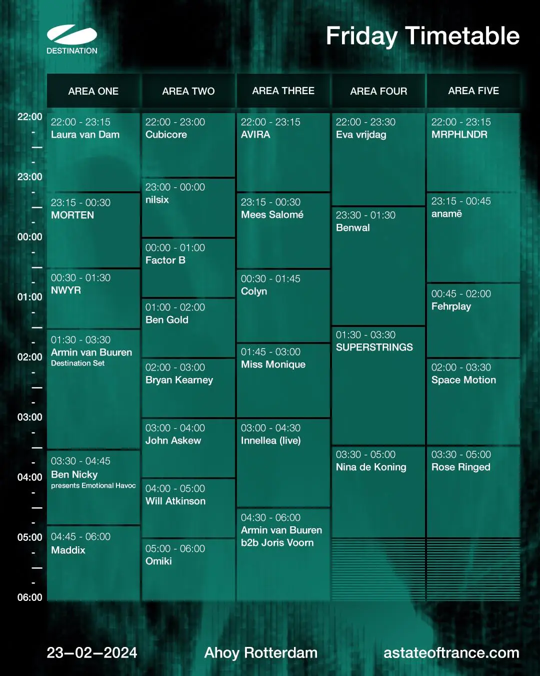 Ich bin gespannt auf die neue Location in Rotterdam. Für mich aufgrund der Entfernung tatsächlich das erste Mal mit Übernachtung vor Ort. Für mich gibt's Freitag gefühlt mehr unschöne Überschneidungen. Grober Plan ist irgendwie ein bisschen viel Stage Hopping, mal sehen was draus wird: Avira, Laura van Dam, Morten, NWYR, Ben Gold, Miss Monique, Superstrings, Space Motion, Armin B2B Joris Voorn.