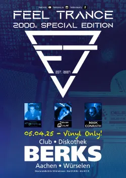 Denn es erwartet euch eine Special Edition der FEEL TRANCE mit einer Songauswahl aus den 2000ern - Vinyl Only! An den Plattentellern sind an diesem Abend die „Vinyljunkies“ PEPPY (Dorsten) und MAIK CONRATH (Herne) zu Gast und werden zusammen mit Resident STEVEN LIQUID 7 Stunden lang das Beste drehen was ihre Plattenkoffer zu bieten haben. Erinnerungen, Emotionen und Freude sind da vorprogrammiert.