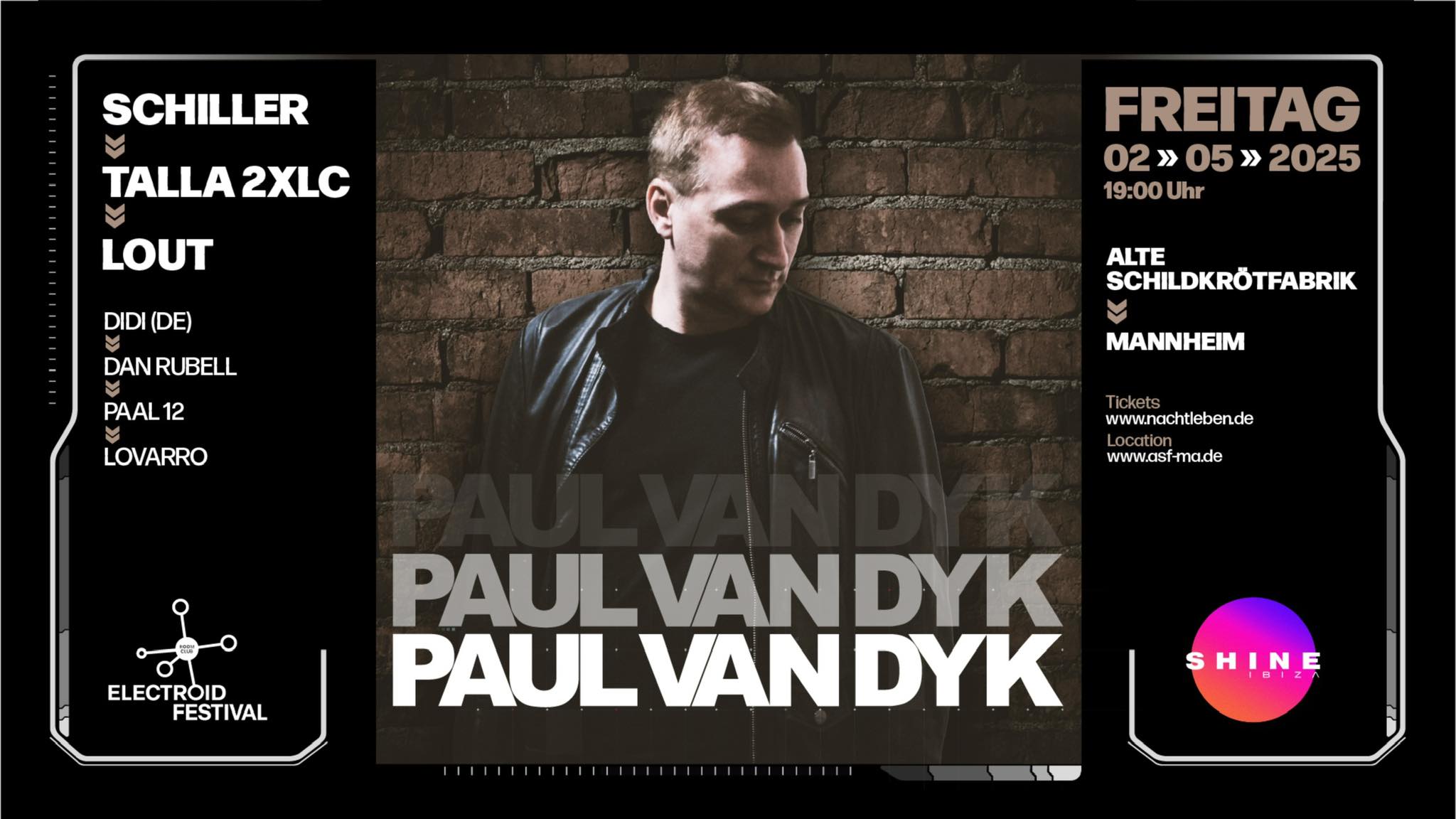 21. April 2025 um 15:17 #1 Paul van Dyk, Schiller und Talla 2XLC sind die Headliner des Electroid Festivals am Freitag, 2. Mai 2025, in Mannheim.Tickets: https://www.eventim-light.com/de/a/64804c717…6f6ba4a?lang=de