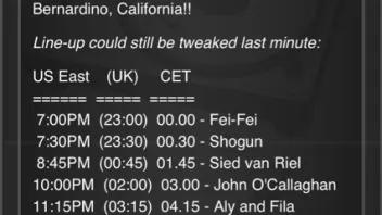 Bei uns fängt es um 23uhr an da ich denke das es noch ein Warm Up set gibt also schon am 22 uhr!Da der Rabb hoffe ich dieses mal ein ebenwürtigen Gegner bekommt denke ich das das ganze bestimmt bis 0.00 uhr geht!