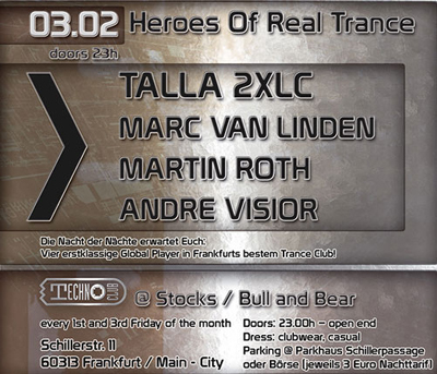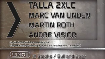 Die Nacht der Nächte erwartet euch, Talla 2XLC präsentiert einige der besten Trance DJs dieser Hemisphäre exklusiv im Technoclub! Zum ersten Mal dabei ist „Shootingstar“ Martin Roth, derzeit mit seinen Produktionen und Remixen weltweit in aller Munde. Nach längerer Zeit ist auch Marc van Linden wieder am Start, dazu Talla himself und Resident André Visior – das macht vier erstklassige Global Player in Frankfurts bestem Trance Club! Zudem wird Part 1 der Stocks-Closing gefeiert. Don’t miss it! - We are Technoclub!
